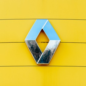 Logotipo lettermark con fondo negro y elementos blancos, tipografía en fuente sans-serif. Una letra blanca estilizada 'R' est