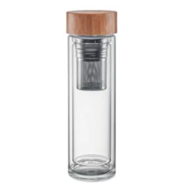 Botella de cristal (vidrio de borosilicato) de doble capa. Tapa de bambú con infusor de té. Capacidad: 400 ml. Como el bambú es un material natural, el color por artículo puede variar. Anti fugas. El grabado a láser no es posible en el vidrio de borosilicato.