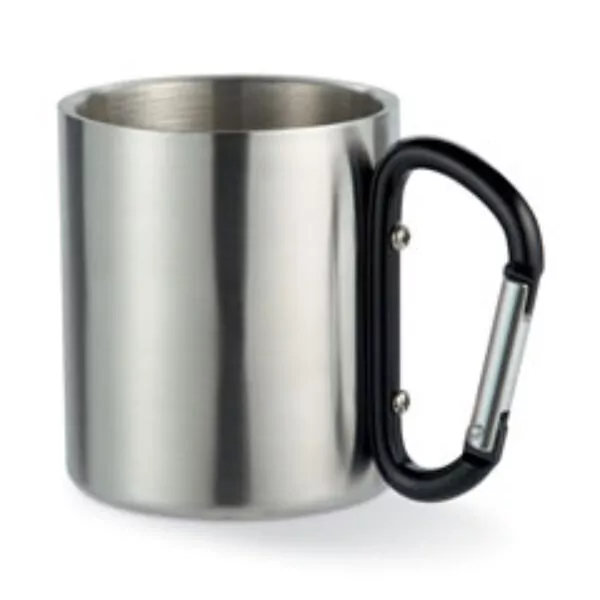 Taza de acero inoxidable de doble capa con asa de mosquetón. Capacidad: 220 ml.
