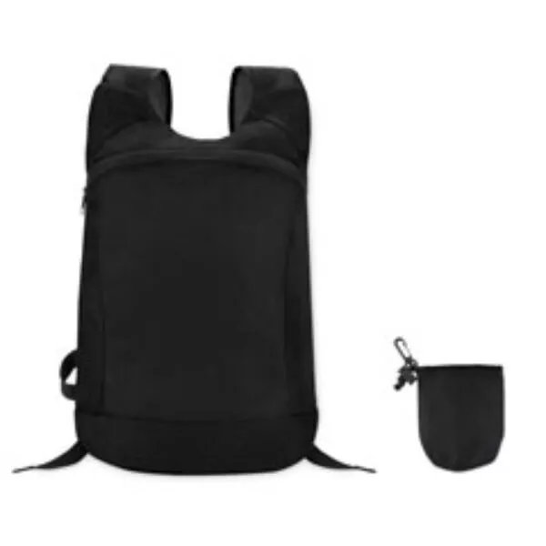 Mochila deportiva plegable de poliéster ripstop con apertura frontal con cremallera, correas de malla y funda acoplada.