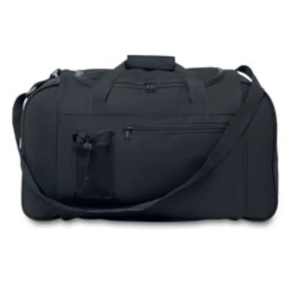 Bolsa deportiva en poliéster 600D con bolsillo frontal y bolsillo de rejilla. Bandolera ajustable y desmontable.