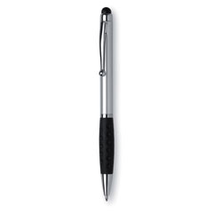 Bolígrafo con mecanismo giratorio de plástico en ABS con acabado metálico, empuñadura en ABS y punta de silicona flexible para dispositivos de pantalla táctil. Tinta azul.