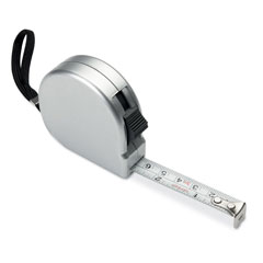 Cinta métrica de 2m en ABS en color plateado mate. Incluye correa de mano para sujetarla y clip de metal plateado.