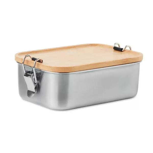 Fiambrera de acero inoxidable con fuertes hebillas de cierre laterales y tapa de bambú. Capacidad: 750 ml. El bambú es material natural, el color del articulo puede variar.