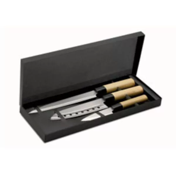 Set de cuchillos de 3 piezas estilo japonés en caja de regalo. Lámina de acero inoxidable y empuñadura de plástico PP.
