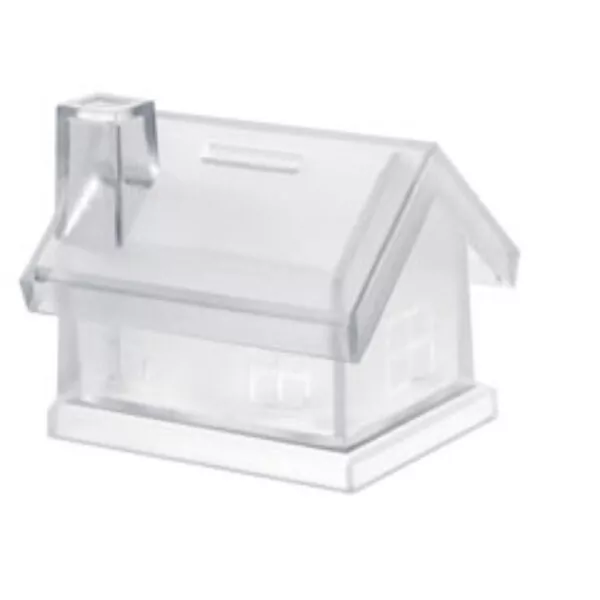 Hucha de plástico con forma de casa.