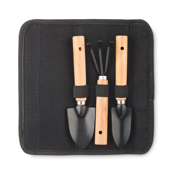 Set de 3 herramientas de jardinería. Rastrillo y 2 palas. Presentado en bolsa de fieltro RPET.