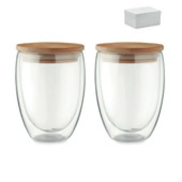 Set de 2 vasos de vidrio de borosilicato de doble pared con tapa de bambú con junta de silicona. Capacidad de 350 ml. El bambú es material natural, el color del articulo puede variar.