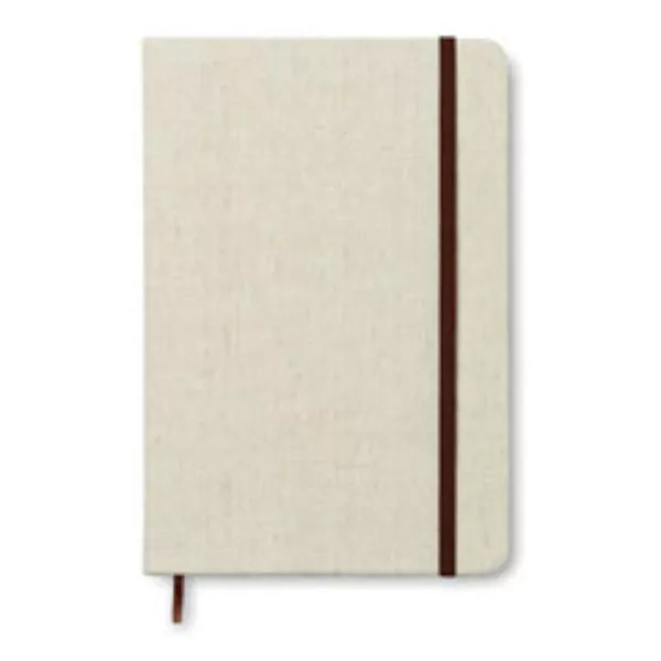 Libreta A5 con tapa de canvas. 96 hojas rayadas. Banda elástica y marca páginas.