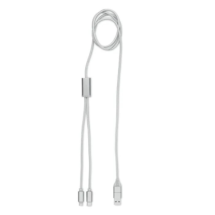 Cable de carga con terminaciones de aluminio con entrada: 2 en 1 tipo C y tipo A y micro B (2 en 1 clavija), salida de tipo C y micro B. Longitud del cable: 120 cm.