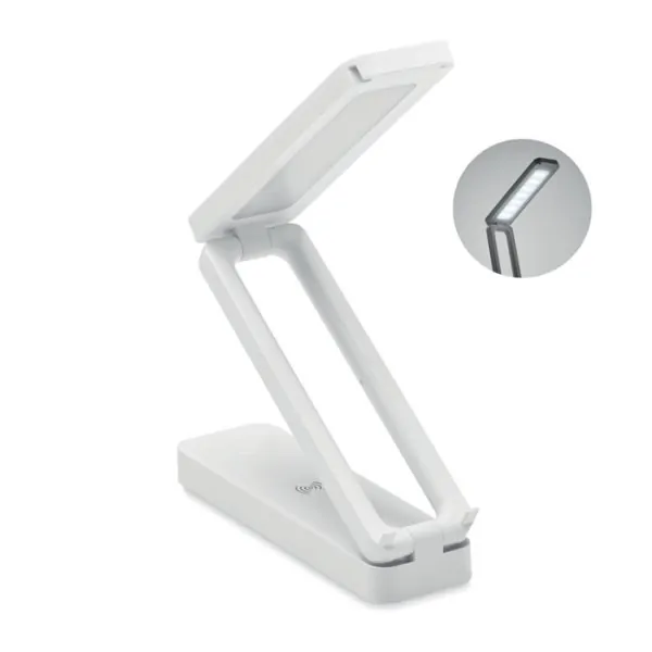 Lámpara plegable de ABS con 14 luces LED. 3 ajustes de brillo. Función cargador inalámbrico 10W. Salida: DC 9V/1.1A (10W) de carga rápida. Compatible con últimos Android, iPhone® 8 y más recientes.