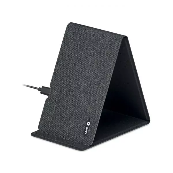Base soporte para teléfono jaspeado RPET 300D para carga inalámbrica 15W. Salida: 9V/1.6A (15W) para una carga rápida. Compatible con los últimos Androids, iPhone® 8y más recientes.