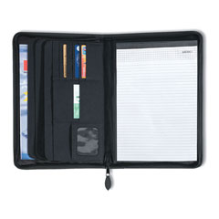 Porta documentos A4 con cremallera, 4 compartimentos y porta tarjetas. Incluye bloc de notas de 20 hojas. Material poliéster 600D, forro 210T.