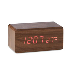 Reloj despertador con display LED con función alarma, hora, temperatura y carga inalámbrica. Fabricado en efecto madera de chapa (MDF). Adaptador de corriente (5W) AC-DC incluido. No apto para su uso en el Reino Unido.