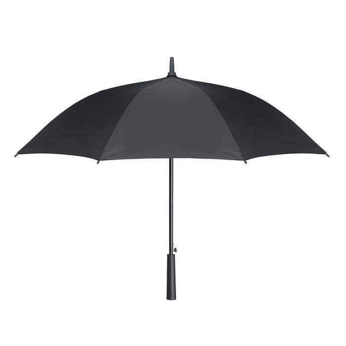Paraguas de 23»» de apertura automática y antiviento en pongee 190T con estructura de fibra de vidrio y eje chapado en negro con puntas de plástico. Mango de ABS con acabado de goma. Cierre manual.
